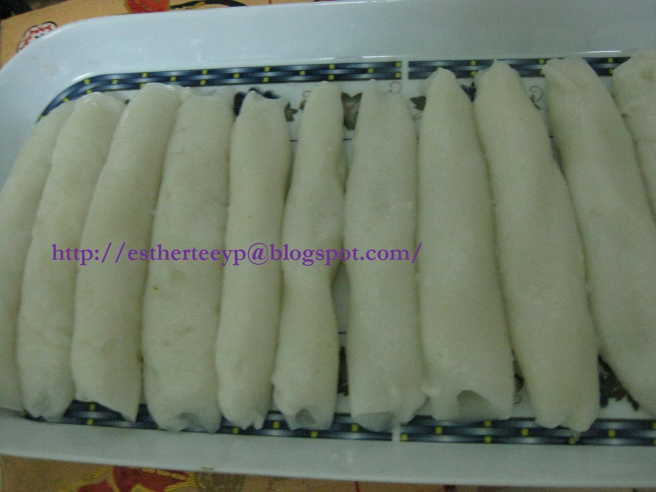 6. 取出,用切蛋糕的塑胶刀把猪肠粉卷成长条,放凉即可淋酱食用。